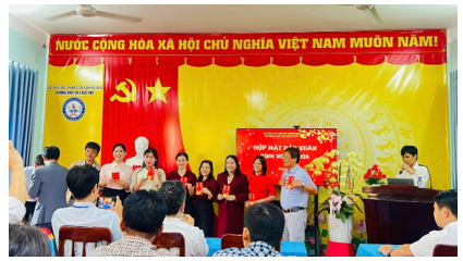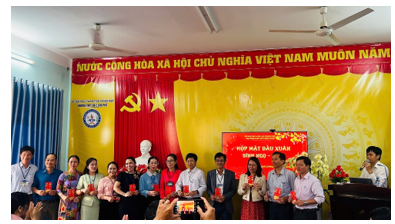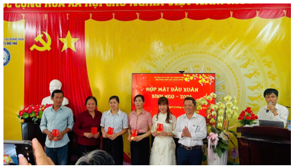 Thầy Thạch Cảnh Bê – Bí thư chi bộ, Hiệu trưởng nhà trường trao lộc đầu năm cho giáo viên tổ Ngoại ngữ trường THPT Số 2 Đức Phổ